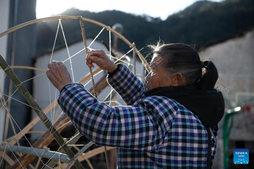 A villager makes fish-shaped lanterns in Wangmantian Village of Xitou Town in Shexian County, Huangshan City of east China's Anhui Province, Feb. 10, 2025. Local villagers have the tradition to make fish-shaped lanterns to pray for harvest and good fortune and parade with them cheerfully around the Lantern Festival, which falls on the 15th day of the first month of the Chinese lunar calendar, or Feb. 12 this year. (Xinhua/Zhang Duan)