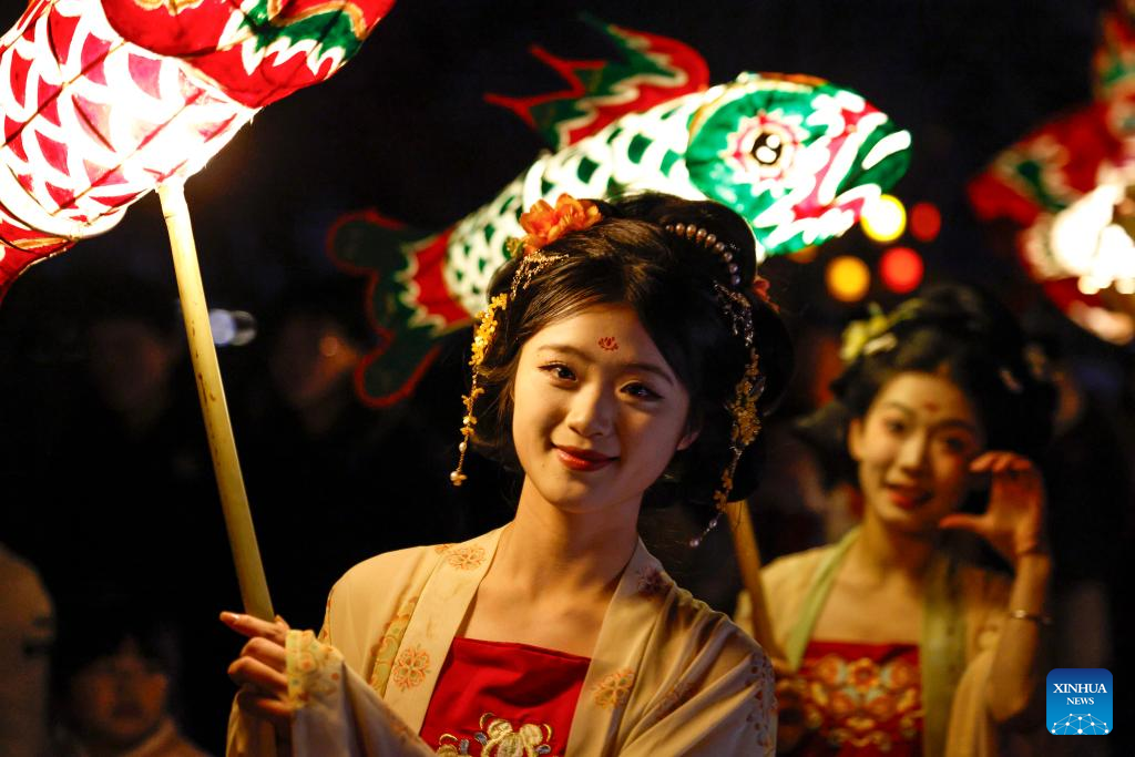 Villagers parade with fish-shaped lanterns in Wangmantian Village of Xitou Town in Shexian County, Huangshan City of east China's Anhui Province, Feb. 10, 2025. Local villagers have the tradition to make fish-shaped lanterns to pray for harvest and good fortune and parade with them cheerfully around the Lantern Festival, which falls on the 15th day of the first month of the Chinese lunar calendar, or Feb. 12 this year. (Photo by Shi Yalei/Xinhua)