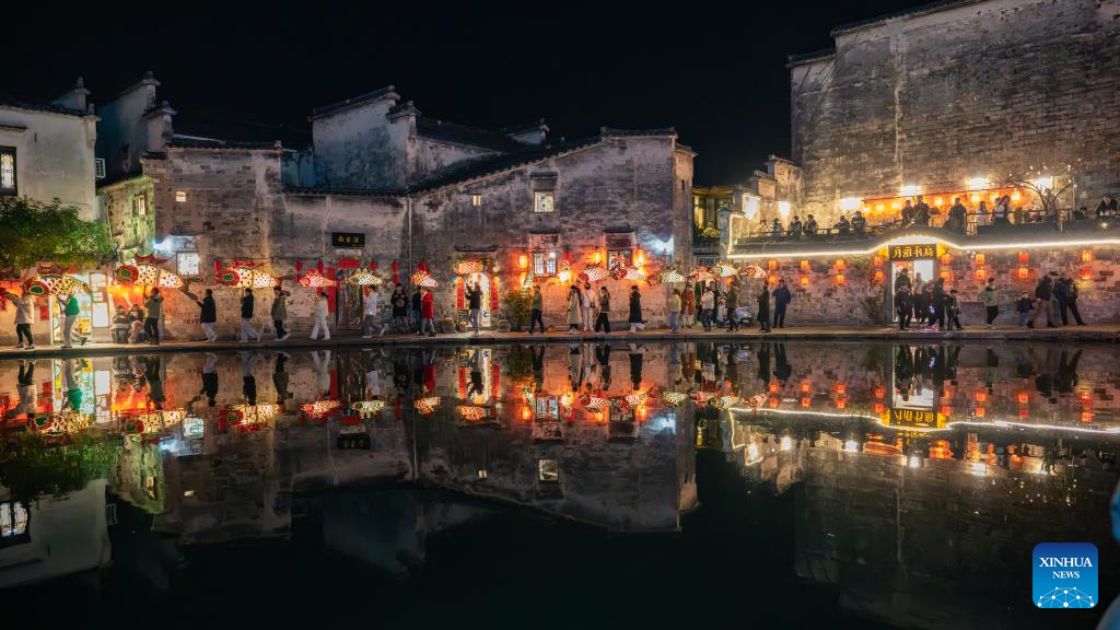 A fish-shaped lantern performance team parades at Hongcun Village, Huangshan City of east China's Anhui Province, Feb. 11, 2025. Locals paraded with fish-shaped lanterns on the eve of the Lantern Festival at Hongcun Village, attracting many tourists. (Photo by Fan Chengzhu/Xinhua)