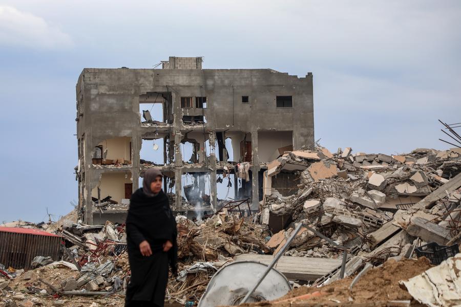 A Palestinian woman stands in front of the ruins of houses near the Netzarim Corridor in the central Gaza Strip, on Feb. 9, 2025. (Photo by Rizek Abdeljawad/Xinhua)