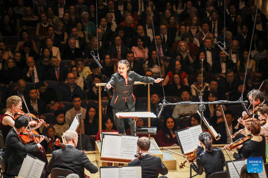 Tianyi Lu conducts in a concert celebrating the Spring Festival by the New York Philharmonic in New York City, the United States, Feb. 11, 2025. (Photo by Winston Zhou/Xinhua)