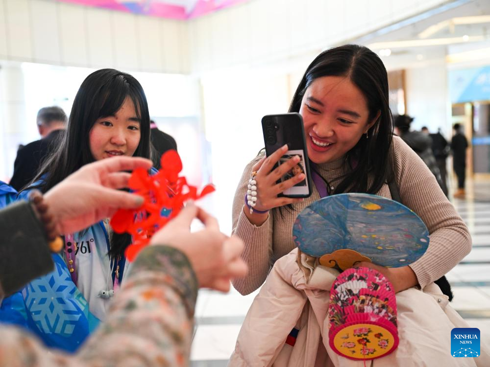 Delegation official Jean Kyle Wico (R) of the Philippines takes photos of the paper cutting work during a cultural event to celebrate the Lanter Festival at the athletes' village of the 9th Asian Winter Games in Harbin, northeast China's Heilongjiang Province, Feb. 12, 2025. (Xinhua/Wang Xi)