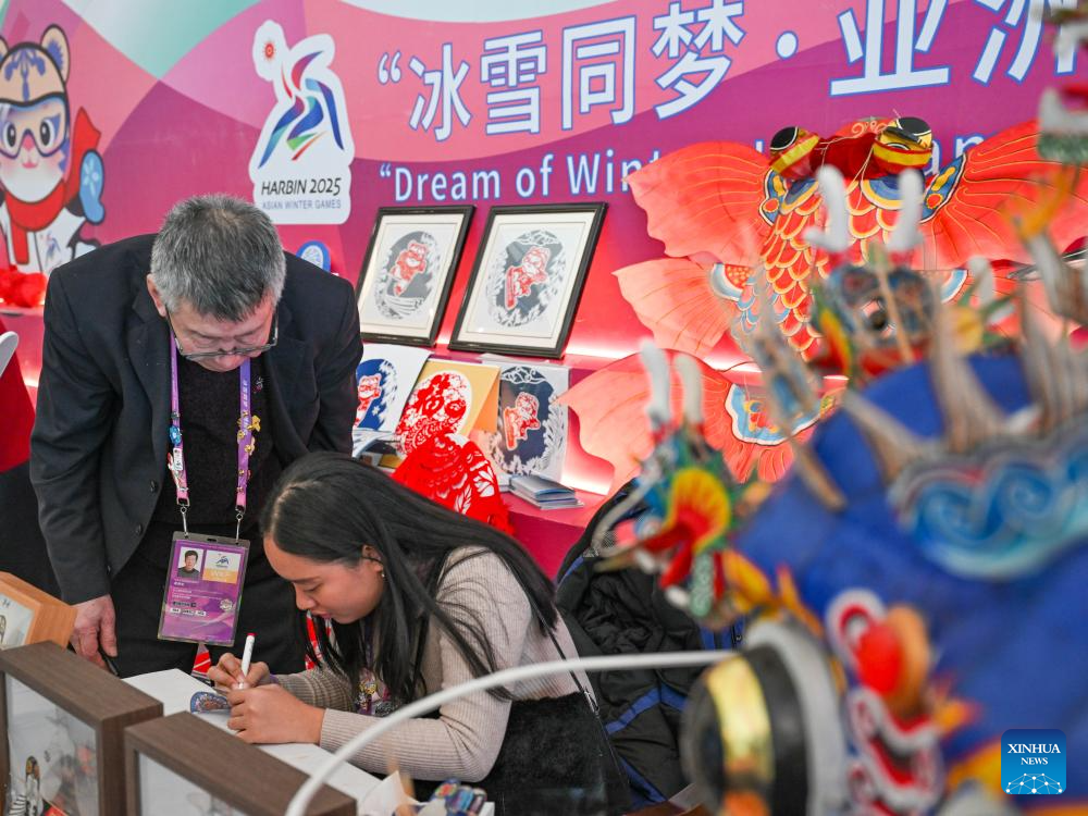 Ice hockey player Zhang Zesen of China tries the rubbing painting during a cultural event to celebrate the Lanter Festival at the athletes' village of the 9th Asian Winter Games in Harbin, northeast China's Heilongjiang Province, Feb. 12, 2025. (Xinhua/Wang Xi)