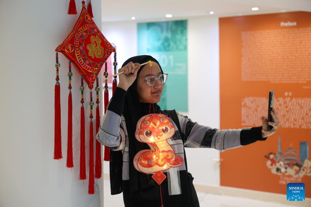 A Moroccan woman takes photos of a snake-shaped lantern at a Lantern Festival celebration event in Rabat, Morocco, on Feb. 12, 2025. (Xinhua/Huo Jing)