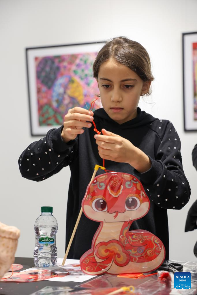 A Moroccan girl makes a snake-shaped lantern at a Lantern Festival celebration event in Rabat, Morocco, on Feb. 12, 2025. (Xinhua/Huo Jing)