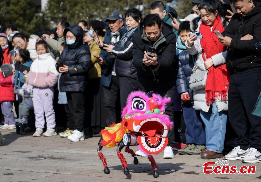 Robot dogs, with lion head-shaped decorations, perform dance alongside traditional lion dancers during a Lantern Festival celebration in Jinan, central China's Shandong Province, Feb. 12, 2025. (China News Service/Zhang Yong)