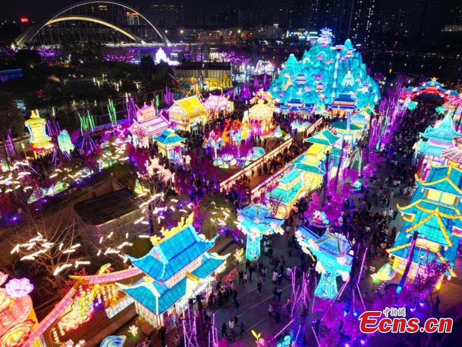Lanterns illuminate the night sky during the 54th Chengdu International Panda Lantern Show, drawing visitors, southwest China's Sichuan Province, Feb. 12, 2025. (China News Service/Zhang Lang)