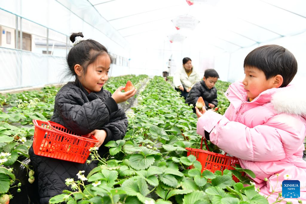 Students pick strawberries in a garden of Yangcunqiao Central Primary School in Jiande City, east China's Zhejiang Province, Feb. 13, 2025. Primary and secondary schools, as well as kindergartens in some regions across China, welcomed the first day of the new semester on Thursday. Students began the term with diverse "first lesson" activities, marking the start of a fresh academic journey. (Photo by Ning Wenwu/Xinhua)