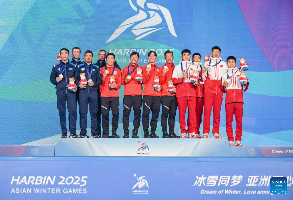 Gold medalists of team Japan (C), silver medalists of team Kazakhstan (L) and bronze medalists of team China attend the awarding ceremony for the biathlon men's 4x7.5km relay match at the 9th Asian Winter Games in Harbin, northeast China's Heilongjiang Province, Feb. 13, 2025. (Xinhua/Lian Zhen)
