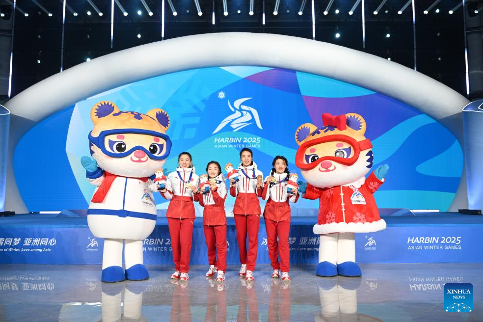Tang Jialin, Wen Ying, Chu Yuanmeng and Meng Fanqi (L to R) of China pose for photo at the victory ceremony for Biathlon women's 4x6km relay at the 9th Asian Winter Games in Harbin, northeast China's Heilongjiang Province, Feb. 13, 2025. (Xinhua/Lian Zhen)
