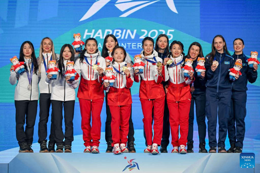 The medalists from China, South Korea and Kazakhstan pose for photo at the victory ceremony for Biathlon women's 4x6km relay at the 9th Asian Winter Games in Harbin, northeast China's Heilongjiang Province, Feb. 13, 2025. (Xinhua/Lian Zhen)