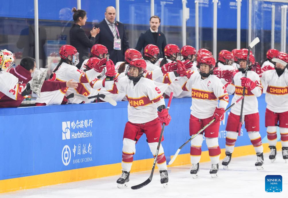 Players of team China celebrate scoring during the women's ice hockey preliminary round group A match between Japan and China at the 9th Asian Winter Games in Harbin, northeast China's Heilongjiang Province, on Feb. 14, 2025. (Xinhua/Sun Fei)