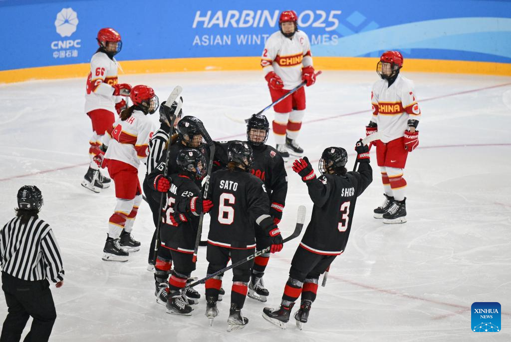 Players of China and Japan react before the women's ice hockey preliminary round group A match between Japan and China at the 9th Asian Winter Games in Harbin, northeast China's Heilongjiang Province, on Feb. 14, 2025. (Xinhua/Yan Linyun)