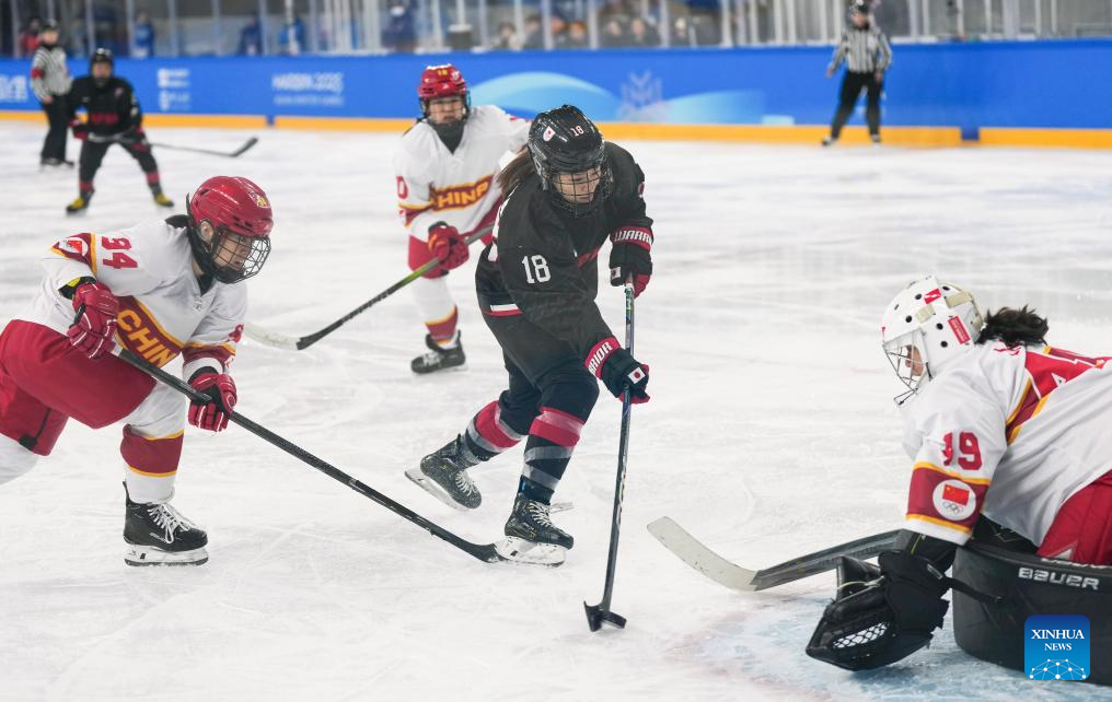 Fang Xin (C) of China competes during the women's ice hockey preliminary round group A match between Japan and China at the 9th Asian Winter Games in Harbin, northeast China's Heilongjiang Province, on Feb. 14, 2025. (Xinhua/Yan Linyun)