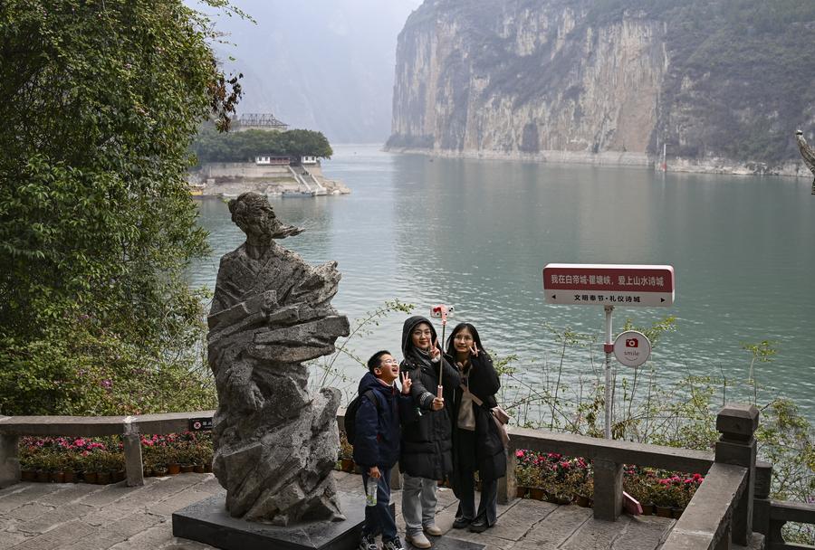 Tourists pose for selfies in the ancient town of Baidi in Fengjie County, southwest China's Chongqing Municipality, Feb. 13, 2025. (Xinhua/Wang Quanchao)