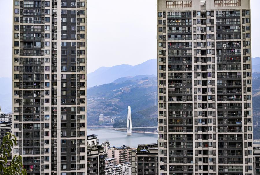 This photo taken on Feb. 12, 2025 shows downtown buildings and the Kuimen bridge crossing the Yangtze River in Fengjie County, southwest China's Chongqing Municipality. (Xinhua/Wang Quanchao)