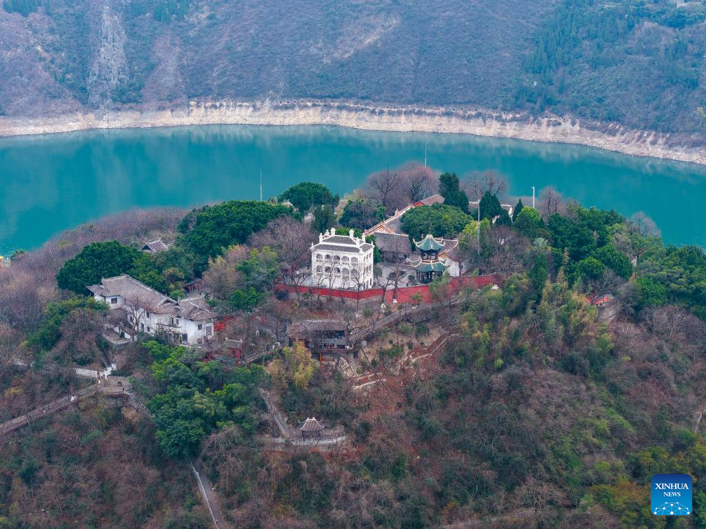 An aerial drone photo taken on Feb. 13, 2025 shows the scenery around the ancient town of Baidi and Qutang Gorge, one of the Three Gorges on the Yangtze River, in Fengjie County, southwest China's Chongqing Municipality. Fengjie, a county in Chongqing where the Kuimen gateway to the magnificent gorges of the Yangtze River is located, gained its reputation as the "city of poetry," as poets, military figures and politicians in history wrote extensively about the forbidding landscape of rapid currents and narrow waterways.