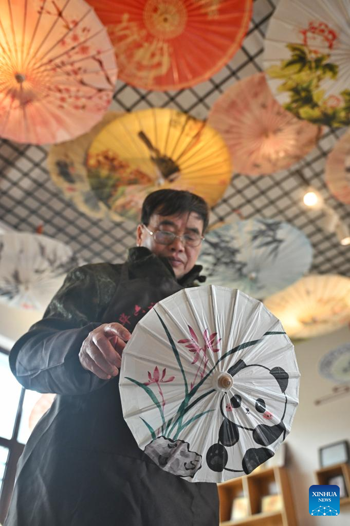 Bi Liufu shows an oil-paper umbrella with traditional patterns in Fenshuiling Town of Luzhou City, southwest China's Sichuan Province, Feb. 11, 2025. (Xinhua/Liu Kun)
