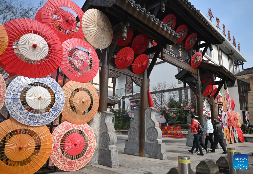 Tourists visit a cultural block themed on oil-paper umbrella in Fenshuiling Town of Luzhou City, southwest China's Sichuan Province, Feb. 11, 2025. (Xinhua/Liu Kun)