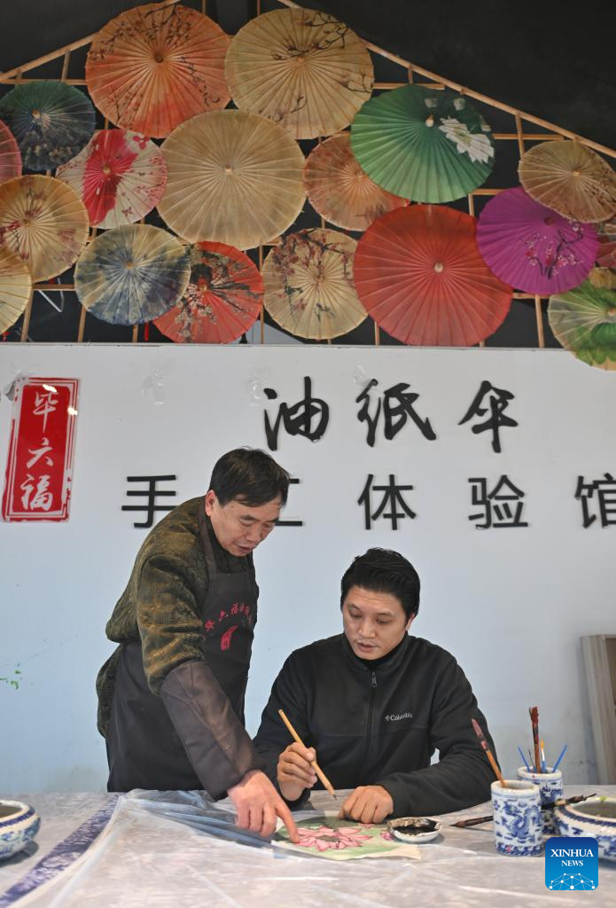 Bi Liufu (L) instructs a craftswoman as the latter makes an oil-paper umbrella in Fenshuiling Town of Luzhou City, southwest China's Sichuan Province, Feb. 11, 2025. (Xinhua/Liu Kun)