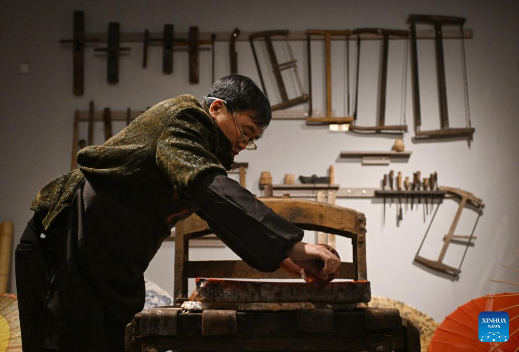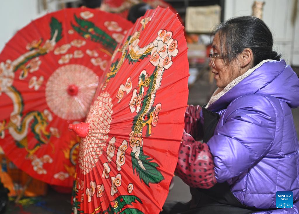 A craftswoman makes an oil-paper umbrella in Fenshuiling Town of Luzhou City, southwest China's Sichuan Province, Feb. 11, 2025. (Xinhua/Liu Kun)
