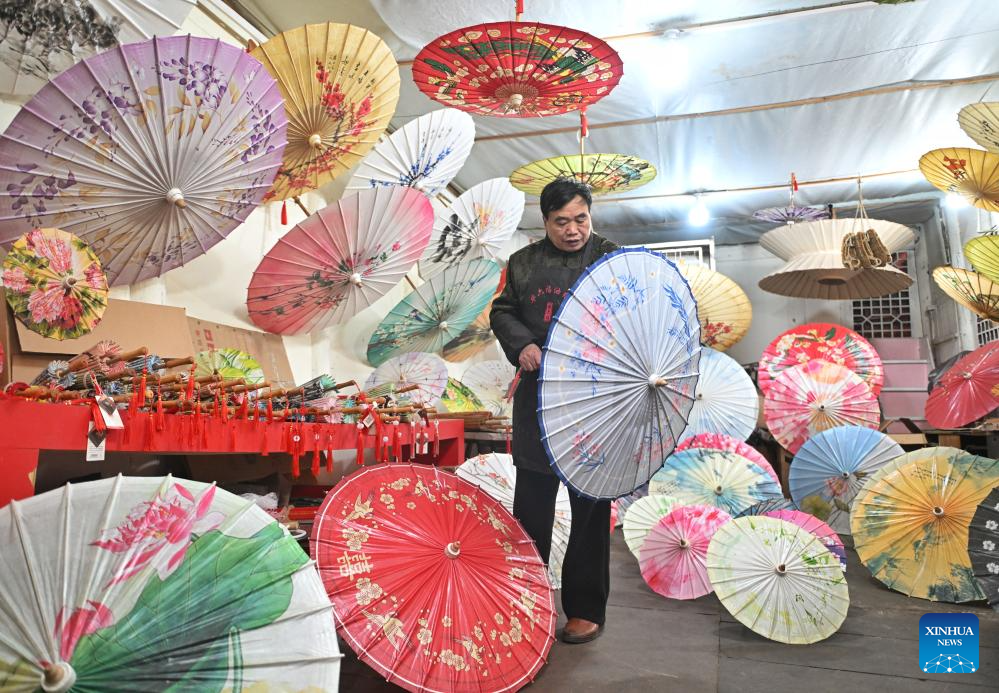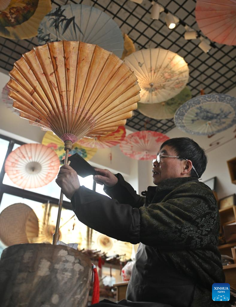 Bi Liufu arranges finished oil-paper umbrellas in Fenshuiling Town of Luzhou City, southwest China's Sichuan Province, Feb. 11, 2025. The making of the Fenshui oil-paper umbrella, which originated in Fenshuiling Town of Luzhou City, is a national-level intangible cultural heritage that boasts a history of over 400 years.
