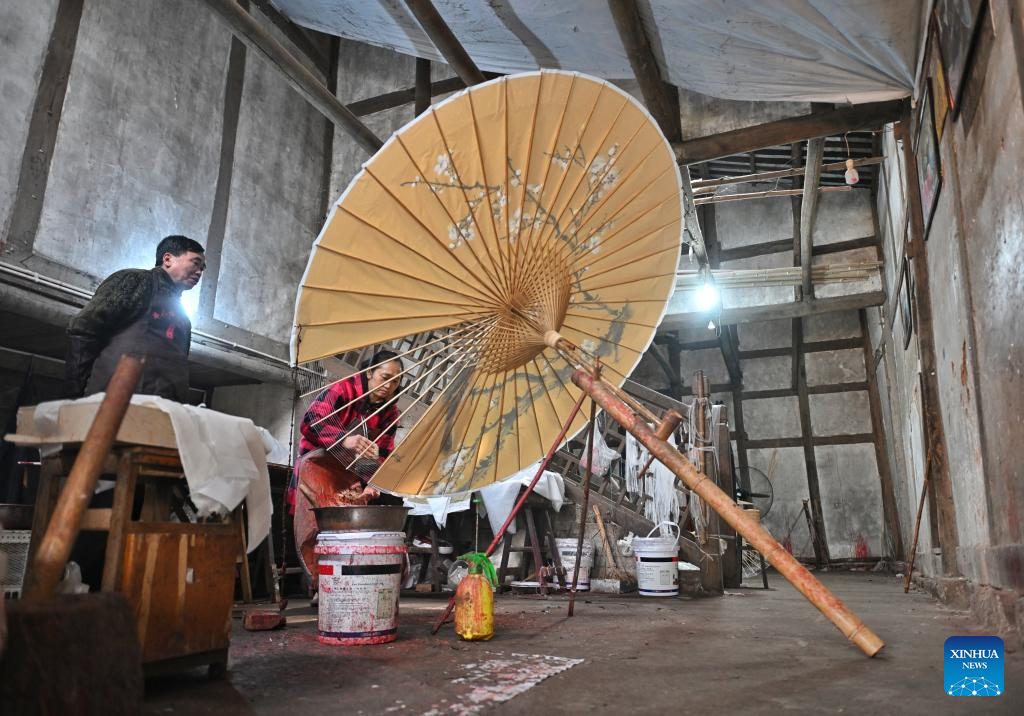 A craftswoman applies tung oil on the cover of an oil-paper umbrella in Fenshuiling Town of Luzhou City, southwest China's Sichuan Province, Feb. 11, 2025. (Xinhua/Liu Kun)