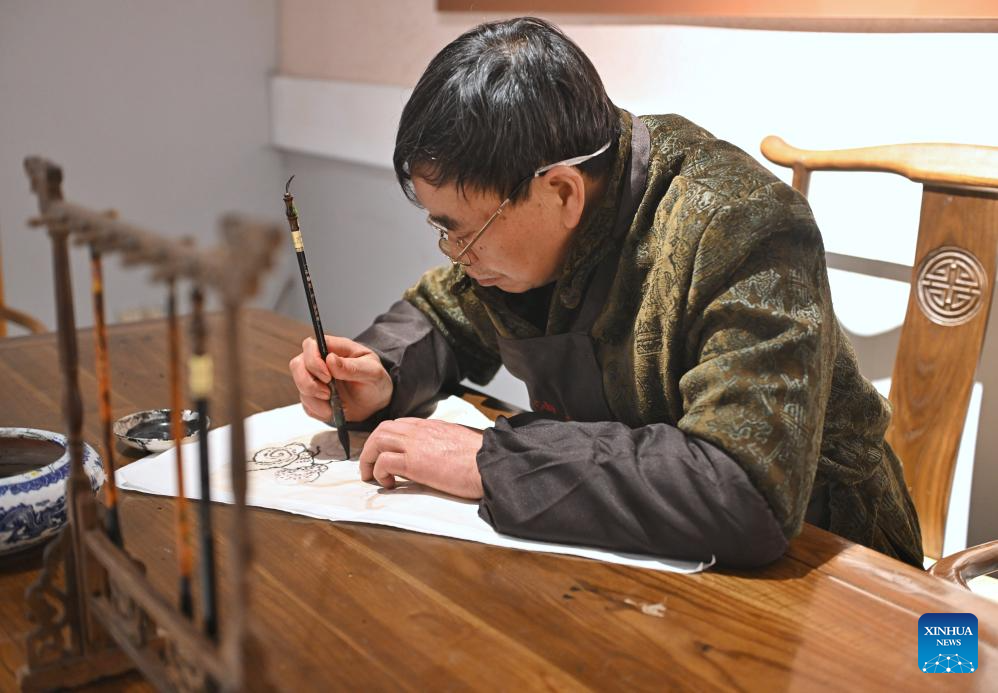 Bi Liufu draws a pattern of oil-paper umbrella in Fenshuiling Town of Luzhou City, southwest China's Sichuan Province, Feb. 11, 2025. (Xinhua/Liu Kun)