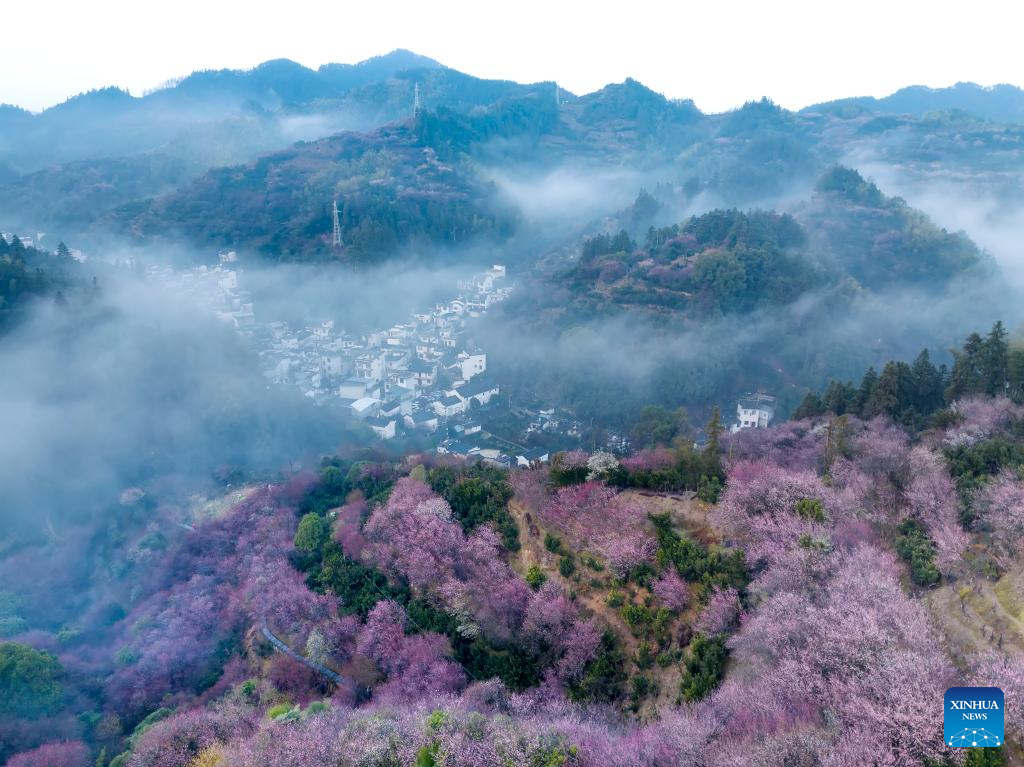 This aerial drone photo taken on Feb. 16, 2025 shows the plum blossoms at a village in Shexian County, Huangshan City, east China's Anhui Province. (Photo by Fan Chengzhu/Xinhua)