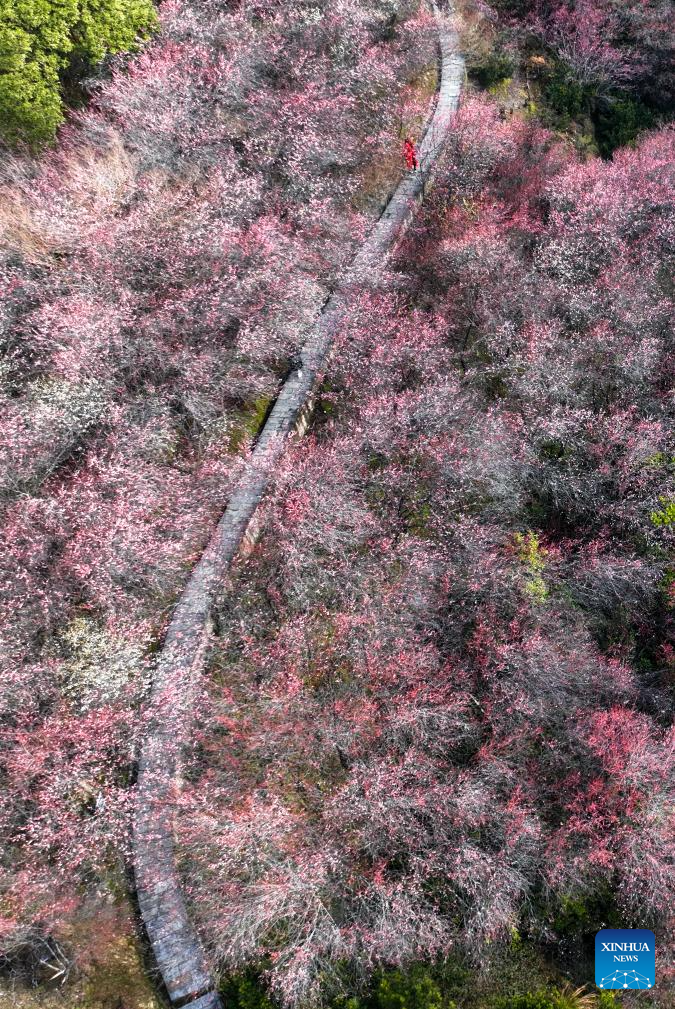 This aerial drone photo taken on Feb. 16, 2025 shows a tourist viewing plum blossoms at a village in Shexian County, Huangshan City, east China's Anhui Province. (Photo by Fan Chengzhu/Xinhua)