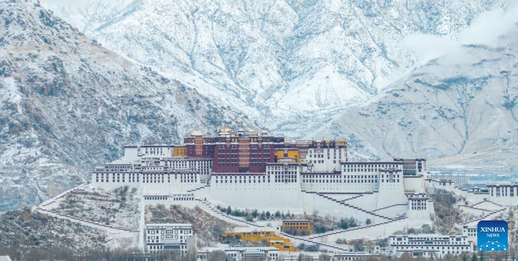 An aerial drone photo taken on Feb. 16, 2025 shows the snow scenery of the Potala Palace in Lhasa, southwest China's Xizang Autonomous Region. (Xinhua/Tenzin Nyida)