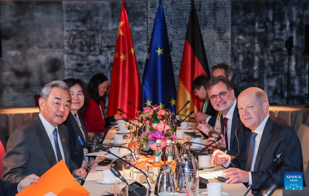 MUNICH, Germany, Feb. 15 (Xinhua) -- German Chancellor Olaf Scholz pledged to enhance exchanges, dialogue and cooperation with China during his meeting with Chinese Foreign Minister Wang Yi here on Saturday.