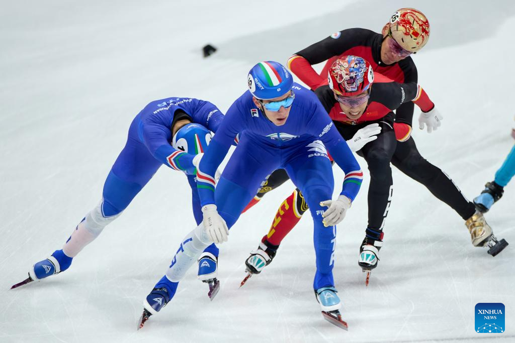 (L to R) Pietro Sighel of Italy, Sun Long of China, Jang Sungwoo of South Korea and Liu Shaoang of China compete during the men's 1000m final A at the ISU Short Track World Tour 2024/2025 in Milan, Italy, Feb. 16, 2025. (Xinhua/Meng Dingbo)