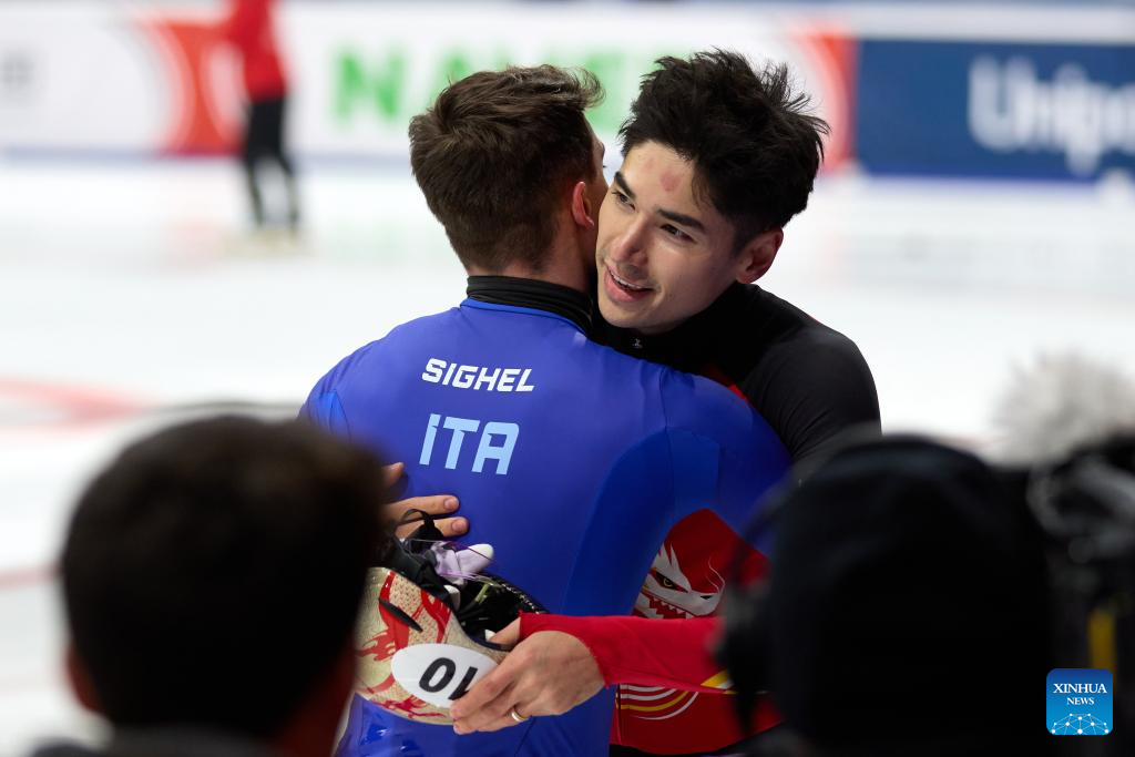 Liu Shaoang (R) of China and Pietro Sighel of Italy greet each other after the men's 1000m final A at the ISU Short Track World Tour 2024/2025 in Milan, Italy, Feb. 16, 2025. (Xinhua/Meng Dingbo)