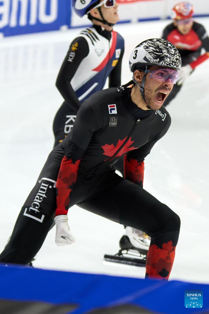 William Dandjinou of Canada celebrates after winning the men's 1000m final A at the ISU Short Track World Tour 2024/2025 in Milan, Italy, Feb. 16, 2025. (Xinhua/Meng Dingbo)