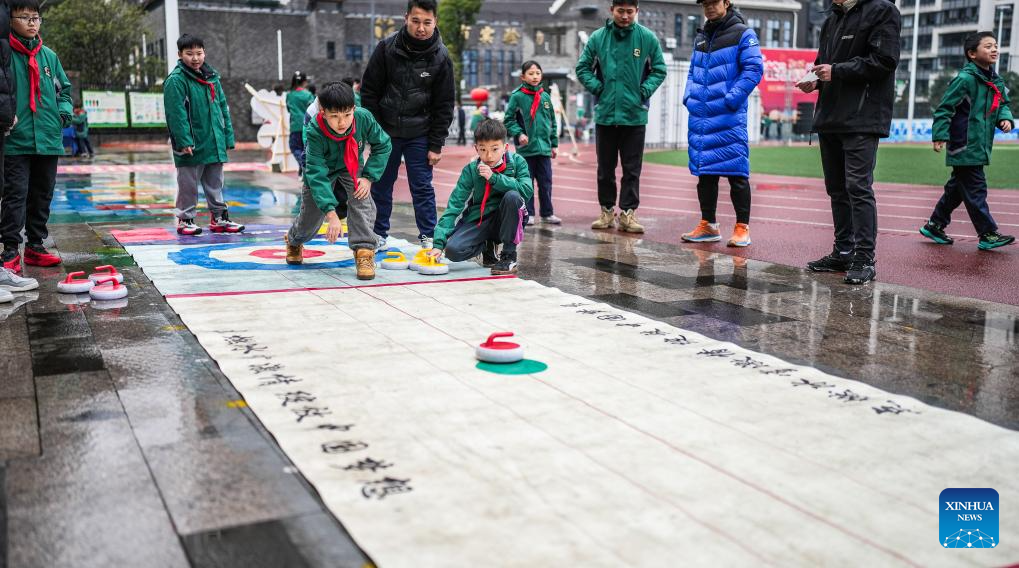 Students try floor curling at a primary school in Guiyang City, southwest China's Guizhou Province, Feb. 17, 2025. The new semester for primary and secondary schools kicked off in many parts of China on Monday. (Xinhua/Tao Liang)