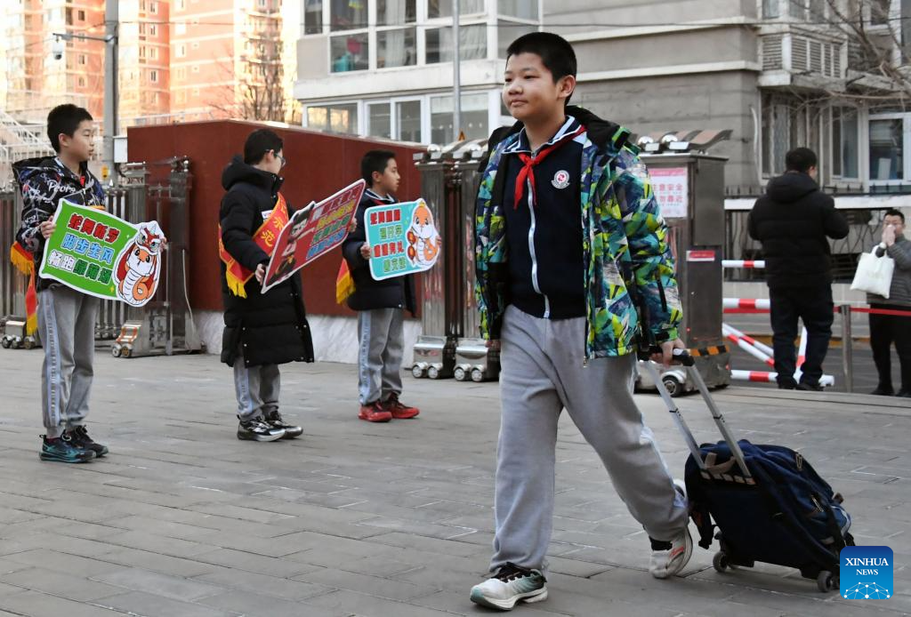 A student walks into a primary school in Haidian District of Beijing, capital of China, Feb. 17, 2025. The new semester for primary and secondary schools kicked off in many parts of China on Monday. (Xinhua/Ren Chao)