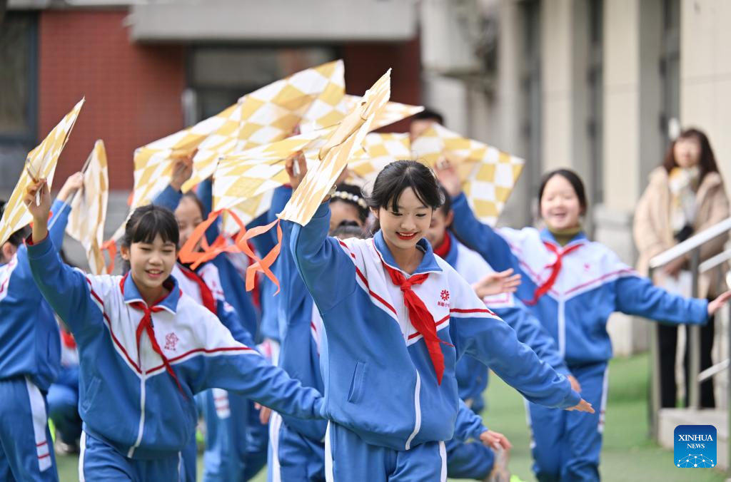 Students perform at the opening ceremony of the new semester at a primary school in north China's Tianjin Municipality, Feb. 17, 2025. The new semester for primary and secondary schools kicked off in many parts of China on Monday. (Xinhua/Li Ran)