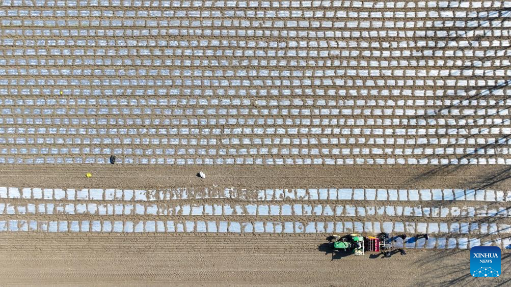 A drone photo taken on Feb. 18, 2025 shows a seeder equipped with the BeiDou Navigation Satellite System sowing in a field during the day of Yushui (Rain Water), the second of the 24 solar terms in the Chinese lunar calendar, in Lintingkou Town, Baodi District, north China's Tianjin Municipality. (Xinhua/Sun Fanyue)