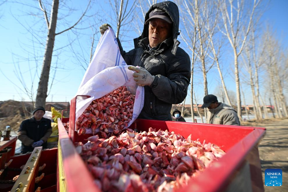 A villager pours garlic into the seeder during the day of Yushui (Rain Water), the second of the 24 solar terms in the Chinese lunar calendar, in Lintingkou Town, Baodi District, north China's Tianjin Municipality, Feb. 18, 2025. (Xinhua/Sun Fanyue)