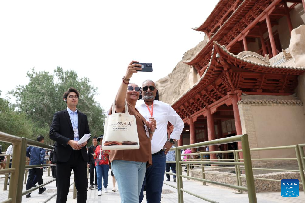 Envoys take a selfie at the Mogao Grottoes in Dunhuang, northwest China's Gansu Province, June 7, 2024. Around 2,000 years ago, Dunhuang was a key hub on the ancient Silk Road. Chinese silk and tea passed through this gateway en route to other countries, while agricultural products such as grapes, carrots and pomegranates made their way into China.