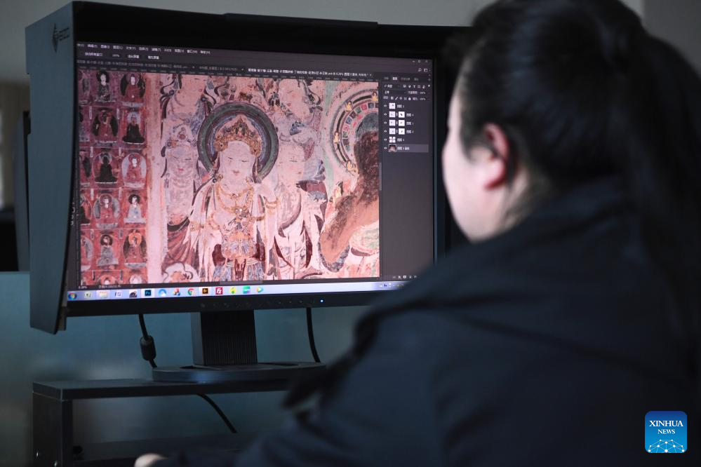 A staff member stitches mural images on a computer at the Dunhuang Academy in Dunhuang, northwest China's Gansu Province, April 25, 2023. Around 2,000 years ago, Dunhuang was a key hub on the ancient Silk Road. Chinese silk and tea passed through this gateway en route to other countries, while agricultural products such as grapes, carrots and pomegranates made their way into China.