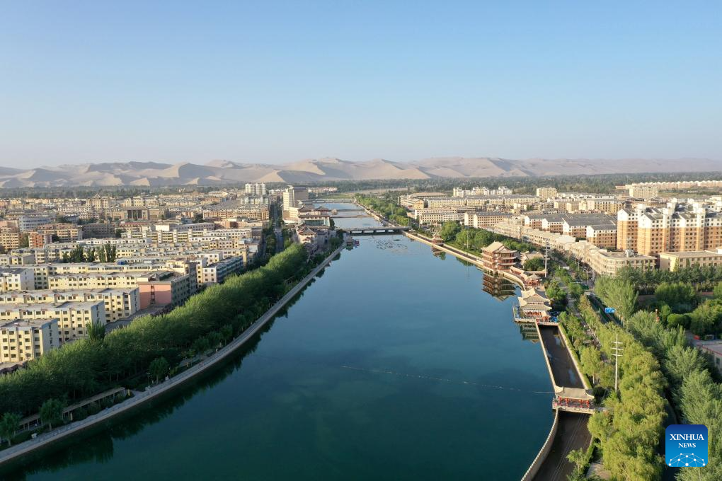 An aerial drone photo taken on June 14, 2023 shows the scenery along Danghe River in Dunhuang, northwest China's Gansu Province. Around 2,000 years ago, Dunhuang was a key hub on the ancient Silk Road. Chinese silk and tea passed through this gateway en route to other countries, while agricultural products such as grapes, carrots and pomegranates made their way into China.