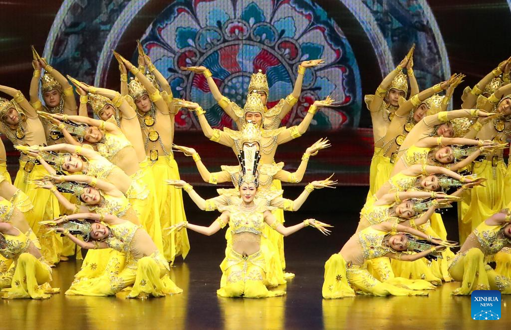 A performance featuring traditional Dunhuang music and dance is staged during the 7th Silk Road (Dunhuang) International Cultural Expo in Dunhuang, northwest China's Gansu Province, Sept. 20, 2024. Around 2,000 years ago, Dunhuang was a key hub on the ancient Silk Road. Chinese silk and tea passed through this gateway en route to other countries, while agricultural products such as grapes, carrots and pomegranates made their way into China.