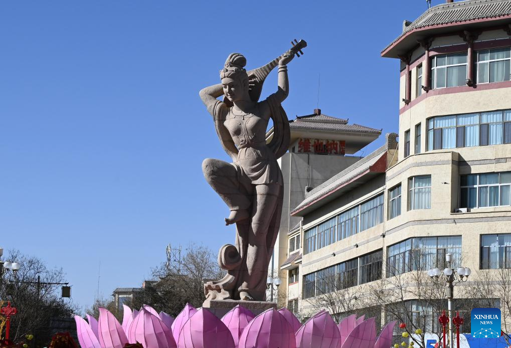 This photo taken on Feb. 12, 2025 shows a statue in Dunhuang, northwest China's Gansu Province. Around 2,000 years ago, Dunhuang was a key hub on the ancient Silk Road. Chinese silk and tea passed through this gateway en route to other countries, while agricultural products such as grapes, carrots and pomegranates made their way into China.