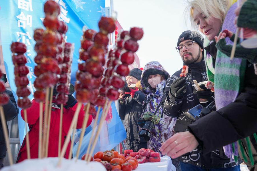 Foreign tourists taste snacks during an ice collecting festival in Harbin, Northeast China's Heilongjiang province, Dec 7, 2024. (Photo/Xinhua)