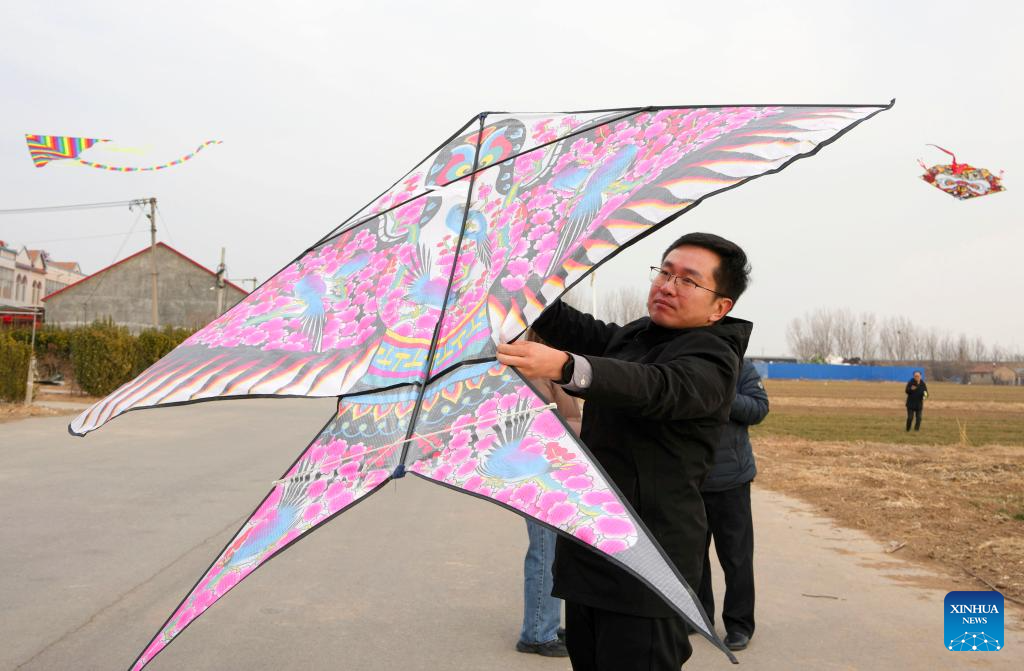 People fly kites to check the quality in Wangjiazhuangzi Village of Fangzi District in Weifang City, east China's Shandong Province, Feb. 18, 2025.