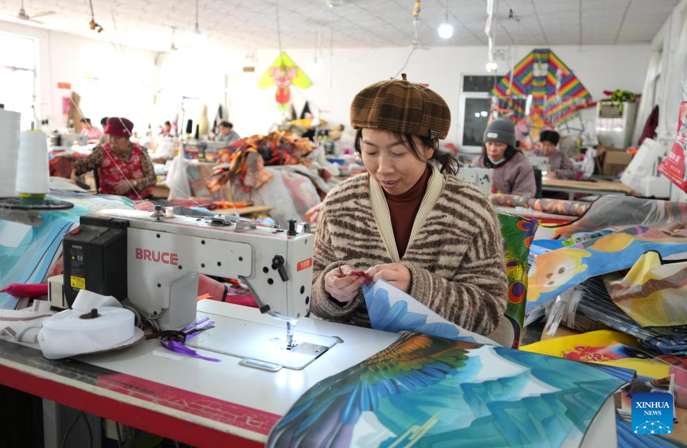 A worker makes kites at a company in Wangjiazhuangzi Village of Fangzi District in Weifang City, east China's Shandong Province, Feb. 18, 2025.