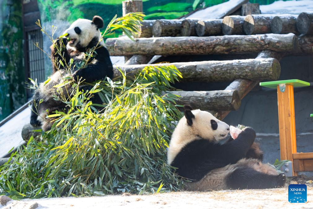 Giant panda Katyusha (R) and its mother Ding Ding enjoy meal at Moscow Zoo in Moscow, Russia, Feb. 18, 2025. Katyusha, Russia's first giant panda cub born at Moscow Zoo, received a chair and a wooden horse as new gifts. Katyusha's father and mother are Ru Yi and Ding Ding, which were sent to Russia in 2019 in commemoration of the 70th anniversary of the establishment of diplomatic relations between China and Russia. (Xinhua/Bai Xueqi)