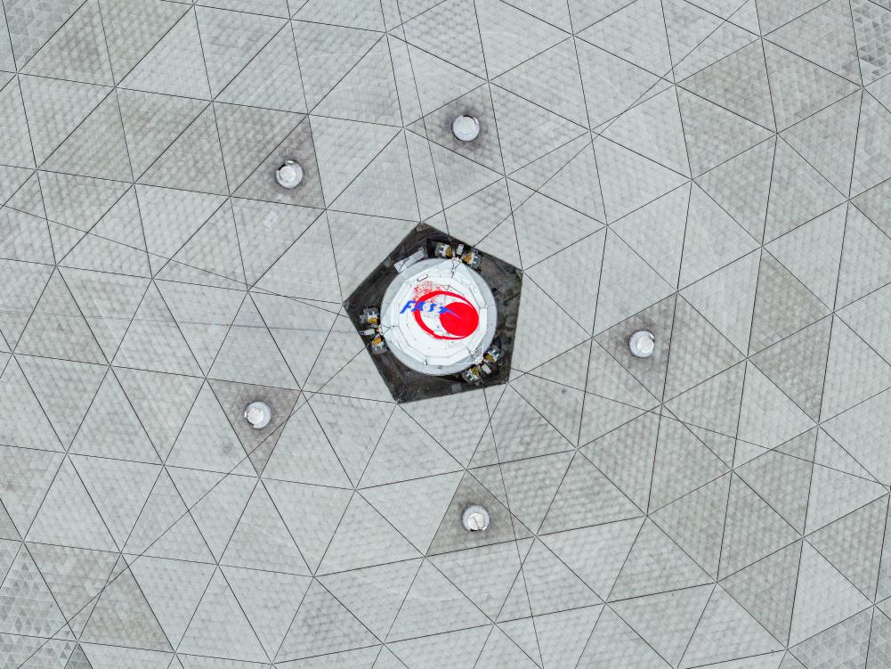 A drone photo taken on Feb. 18, 2025 shows the feed cabin of China's Five-hundred-meter Aperture Spherical Radio Telescope (FAST) under maintenance in southwest China's Guizhou Province. (Xinhua/Ou Dongqu)